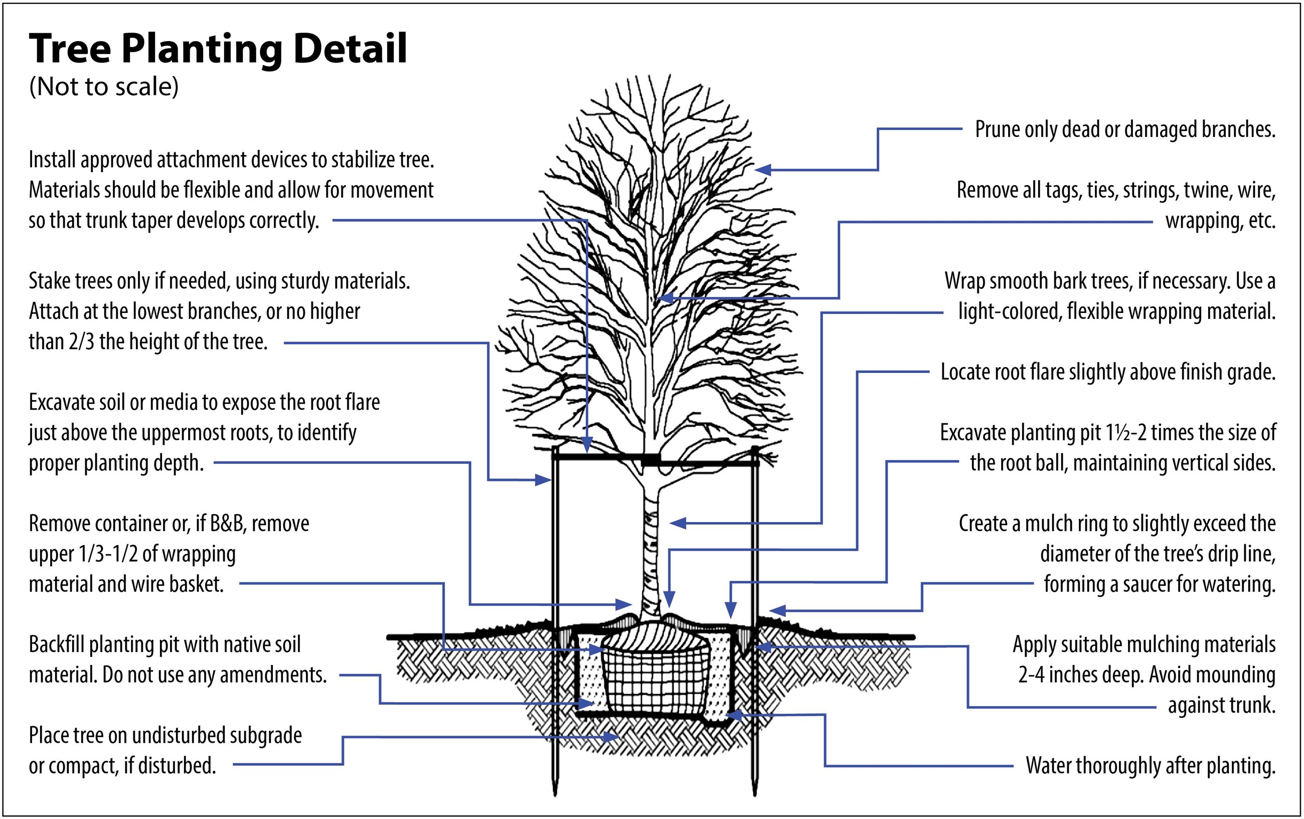 6. Plant tree only as deep as the root ball, the root flare must be at grade.